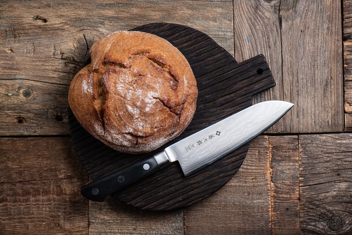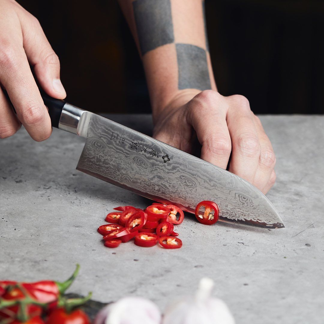 Шеф нож позволяет разделывать, нарезать, быстро шинковать и перекладывать как лопаткой. Сантоку имеет универсальную двустороннюю заточку для правшей и левшей, и высокую режущую способность.