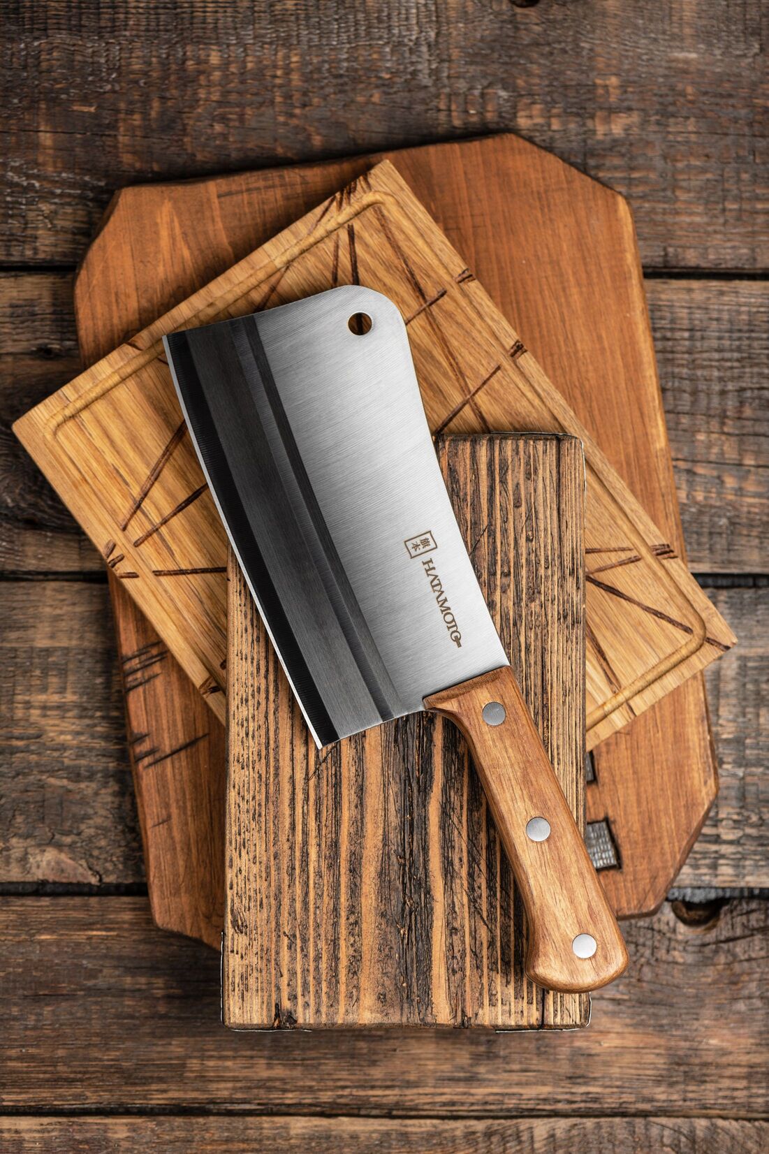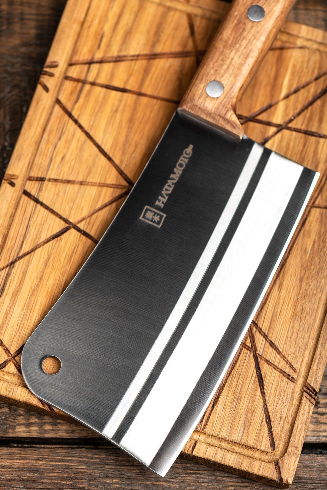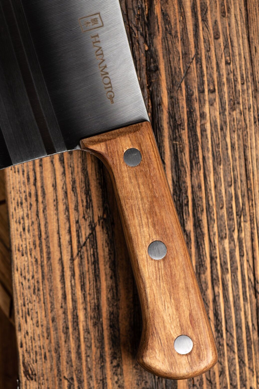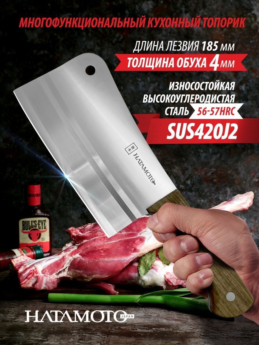 Материал лезвия: SUS420J2 - Твердость лезвия (HRC): 56-57 - Материал рукояти: дерево - Длина лезвия (мм): 185 - Длина общая (мм): 310 - Ширина (мм): 100 - Толщина (мм): 4