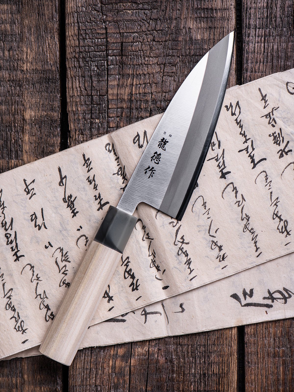 У ножей Ryutoku сменные деревянные гранёные рукоятки. Традиционное исполнение предполагает открытую заточенную пяту лезвия с интервалом до больстера рукоятки.