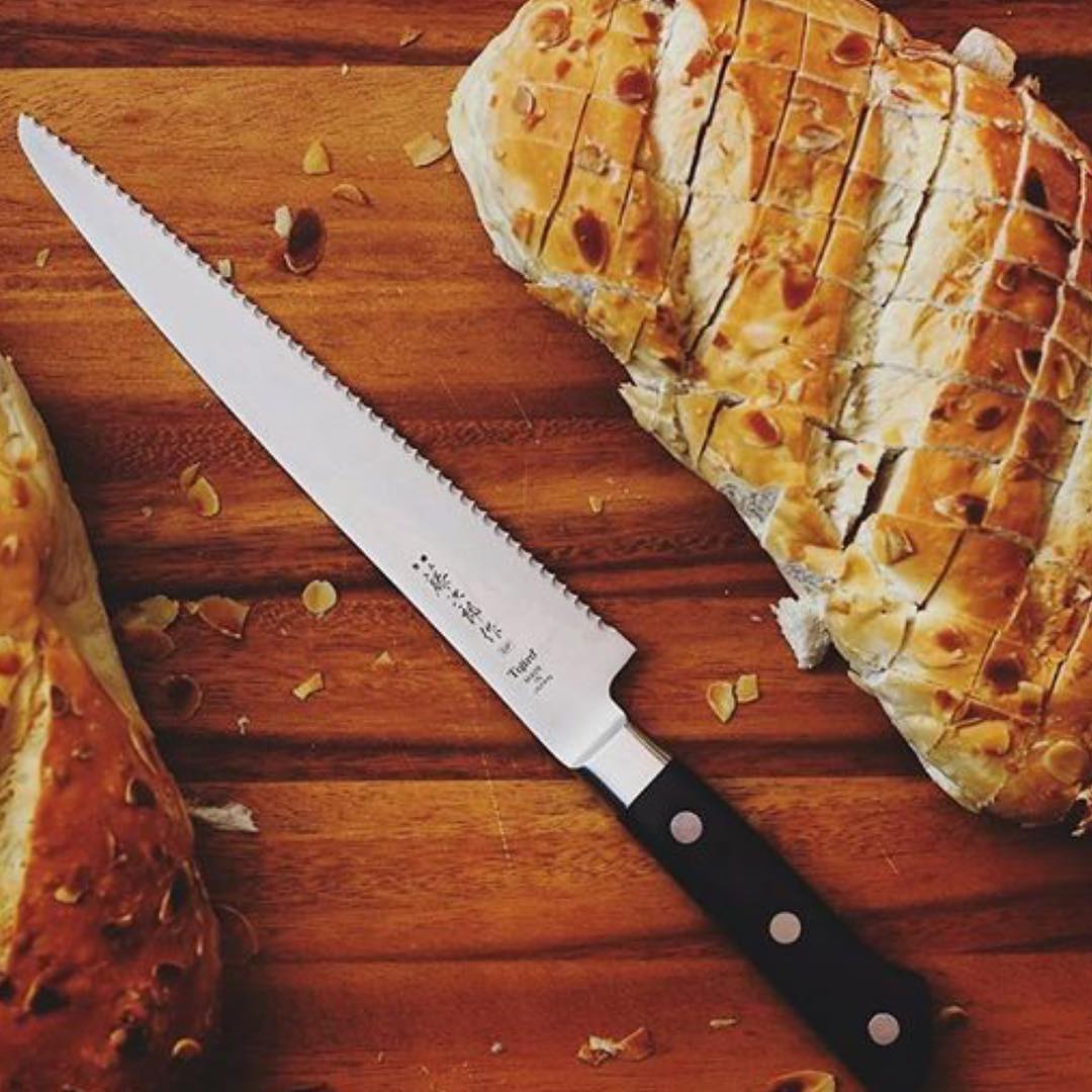 Хлебный нож имеет длинное зазубренное лезвие, прекрасно нарезает продукты с твердой коркой и мягкой внутренностью, как у хлеба, томатов.