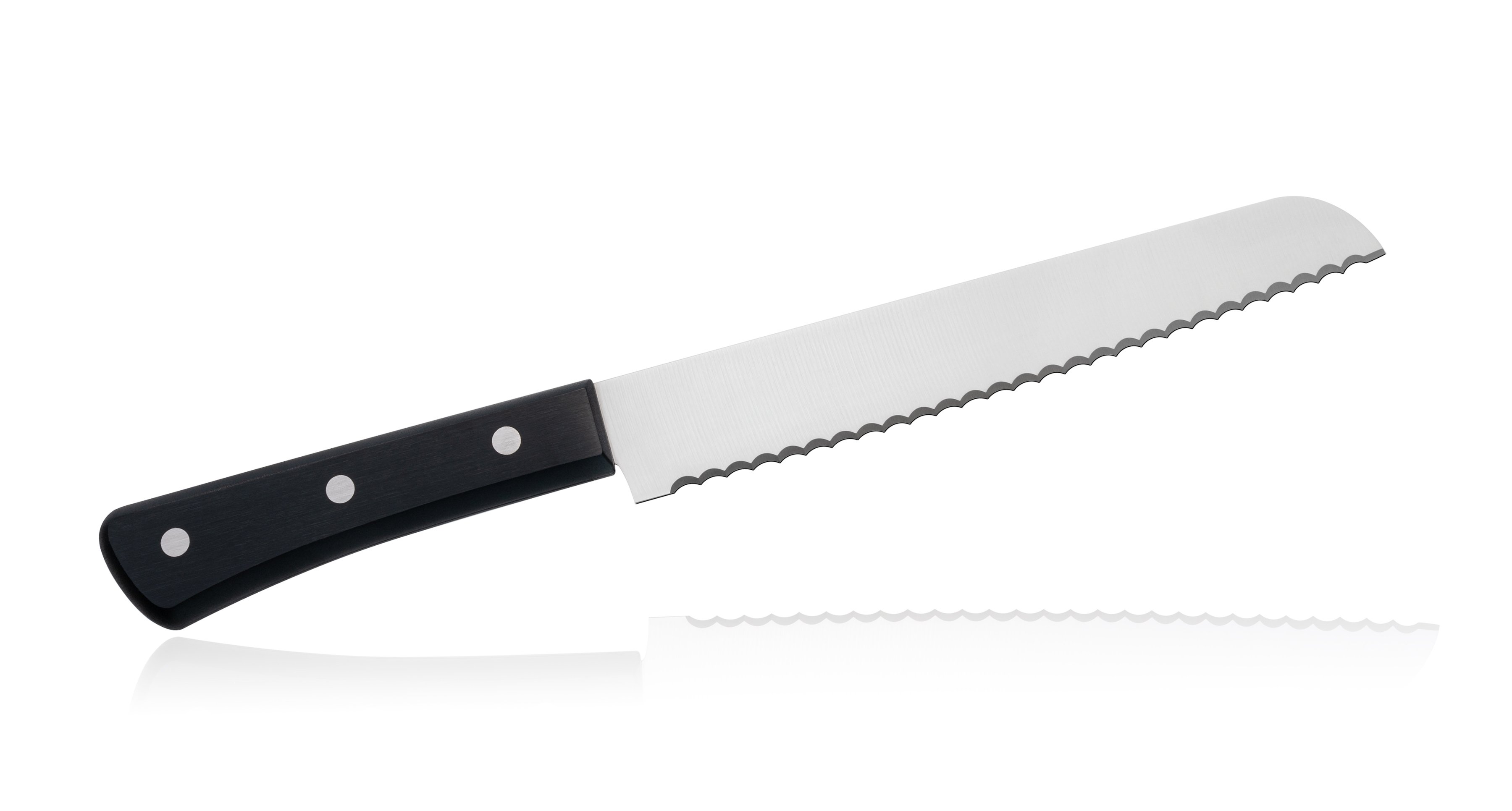 Особенностью данного ножа является его длинное зазубренное лезвие, не требующее заточки, которое прекрасно справляется с нарезкой продуктов с твердой коркой и мягкой внутренностью, таких как хлеб, томаты, свежая выпечка. Благодаря этому ножу, вы сможете нарезать продукты красивыми тонкими ломтиками без крошения и ломки.