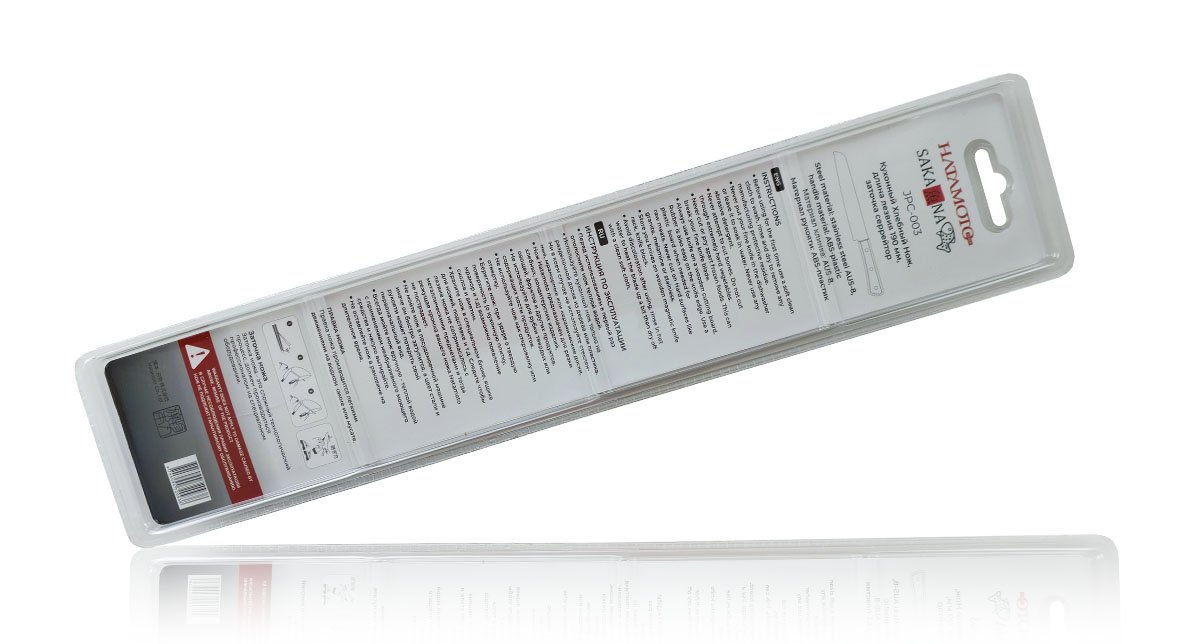В серию Sakana входит: Универсальный нож, длина лезвия 13 см, Поварской шеф нож, длина лезвия 18,5 см, нож Сантоку, длина лезвия 15 см, нож для хлеба длина лезвия 15 см.