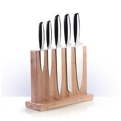 В ассортименте деревянные блоки разных цветов, форм и размеров – подбирайте в зависимости от вашего набора ножей. Подставки имеют валы, в которые могут быть вставлены разные столовые приборы, например, нож шеф-повара, нож для хлеба или нож для очистки овощей. Подставки изготавливаются с углом наклона в 70 градусов, чтобы ножи можно было легко вынимать и вставлять. Также есть дополнительные слоты для мусата и кухонных ножниц.