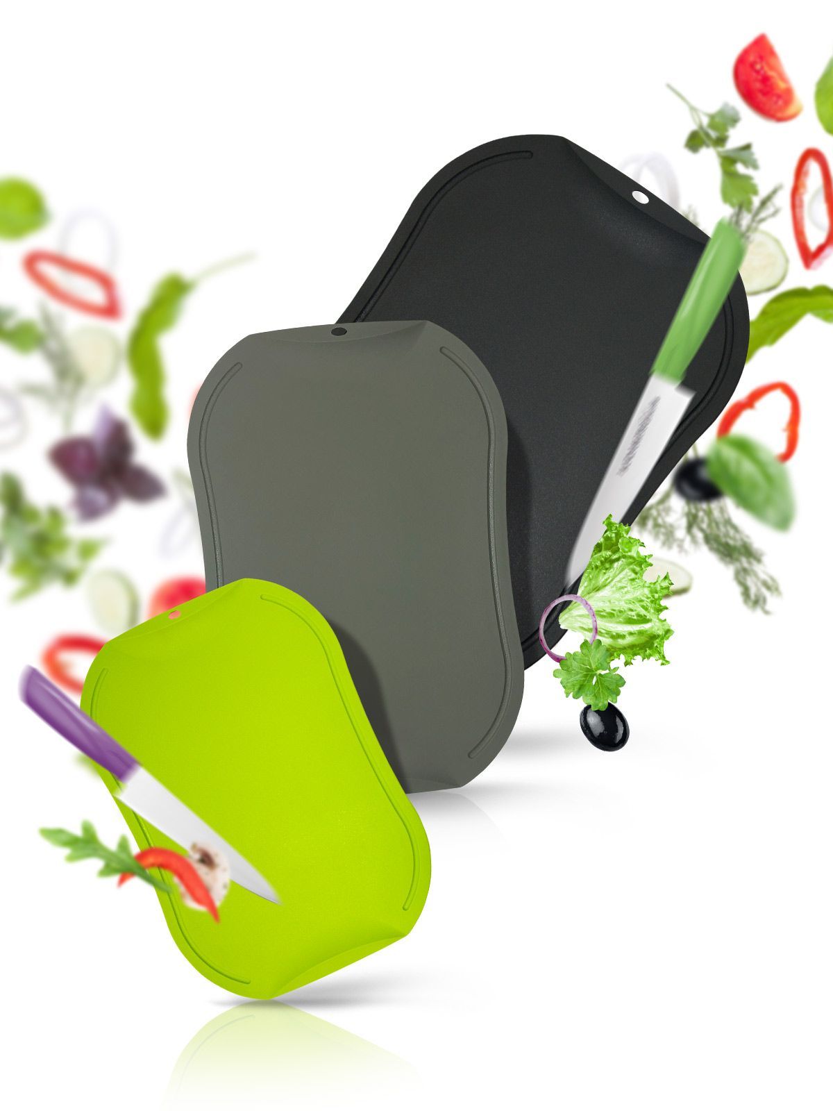 Доска легко гнётся, что позволит быстро и без усилий счистить нарезанные продукты и продолжить работу. Благодаря специальным полостям вдоль доски, жидкости не смогут вытечь за край, что сохранит рабочую поверхность в чистоте. Больше не придется подковыривать доску или искать что-то, чтобы поддеть её, когда вы закончите работу – удобная ручка быстро решит эту проблему.