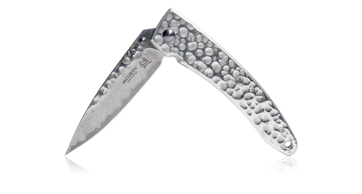 Нож легко и удобно переводится любой рукой из транспортного положения в рабочее и обратно за анодированный двухсторонний упорный штифт на стреловидном клинке из ламината с сердцевиной из стали VG10 в 33-слойных узорчатых обкладках из хром-никелевых нержавеющих сплавов. Формирующая шарнир клинка резьбовая стяжка имеет специальные скользящие шайбы, придающие плавность хода клинку при смене транспортного положения на рабочее.