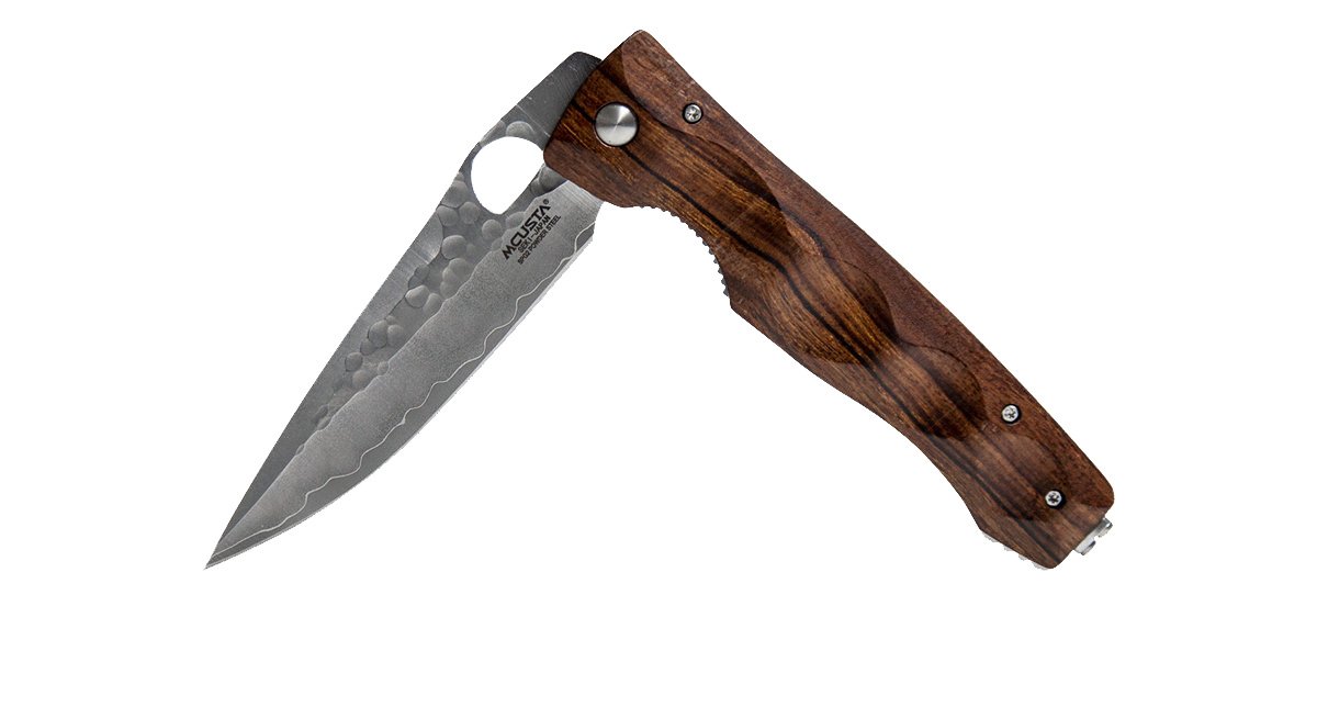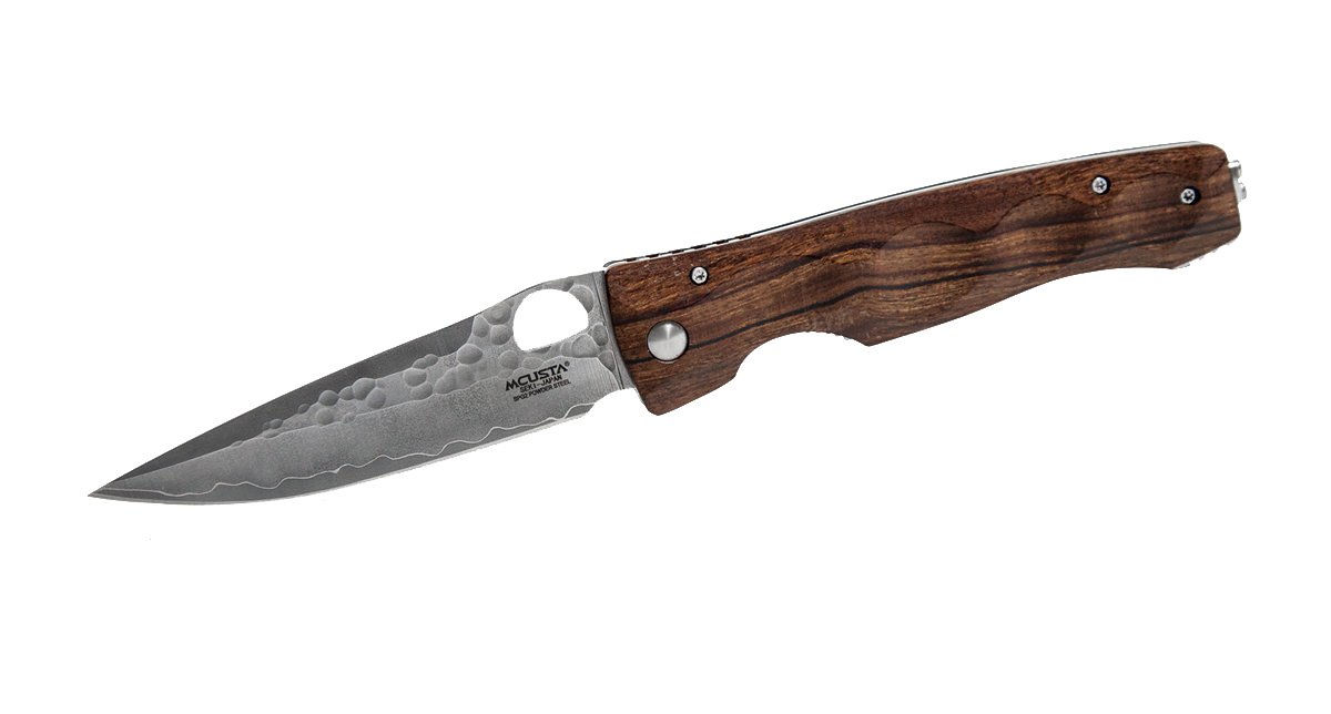Поверхность накладок из аризонского железного дерева имеет волнистую поверхность для более надежного удержания рукояти, которой придается форма, близкая к рукояти меча Вакидзаси, – прямоугольного сечения с боковыми выпуклостями по типу обмотки шелковым шнуром Цукамаки. Формирующая шарнир клинка резьбовая стяжка имеет специальные скользящие шайбы, придающие плавность хода клинку при смене транспортного положения на рабочее. Даже клипса получила декоративный вид за счет художественной выборки лазером излишков металла.