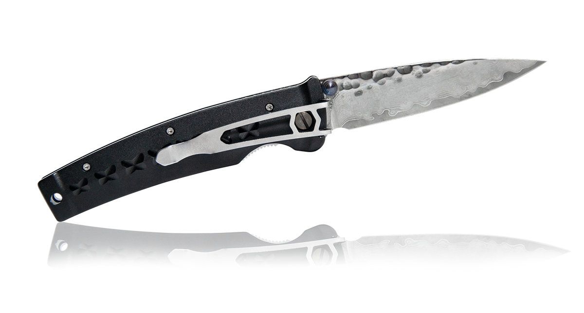 Нож легко и удобно переводится любой рукой из транспортного положения в рабочее и обратно за анодированный двухсторонний упорный штифт на стреловидном клинке из ламината с сердцевиной из стали VG10 в 33-слойных узорчатых обкладках из хром-никелевых нержавеющих сплавов. Формирующая шарнир клинка резьбовая стяжка имеет специальные скользящие шайбы, придающие плавность хода клинку при смене транспортного положения на рабочее.