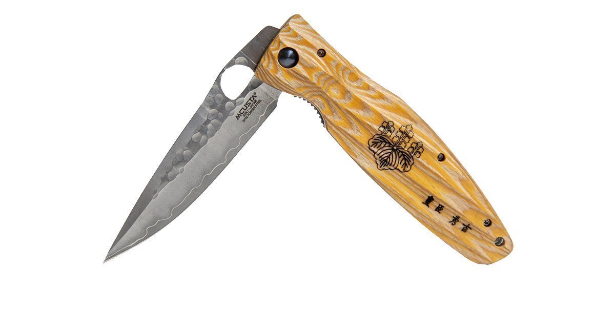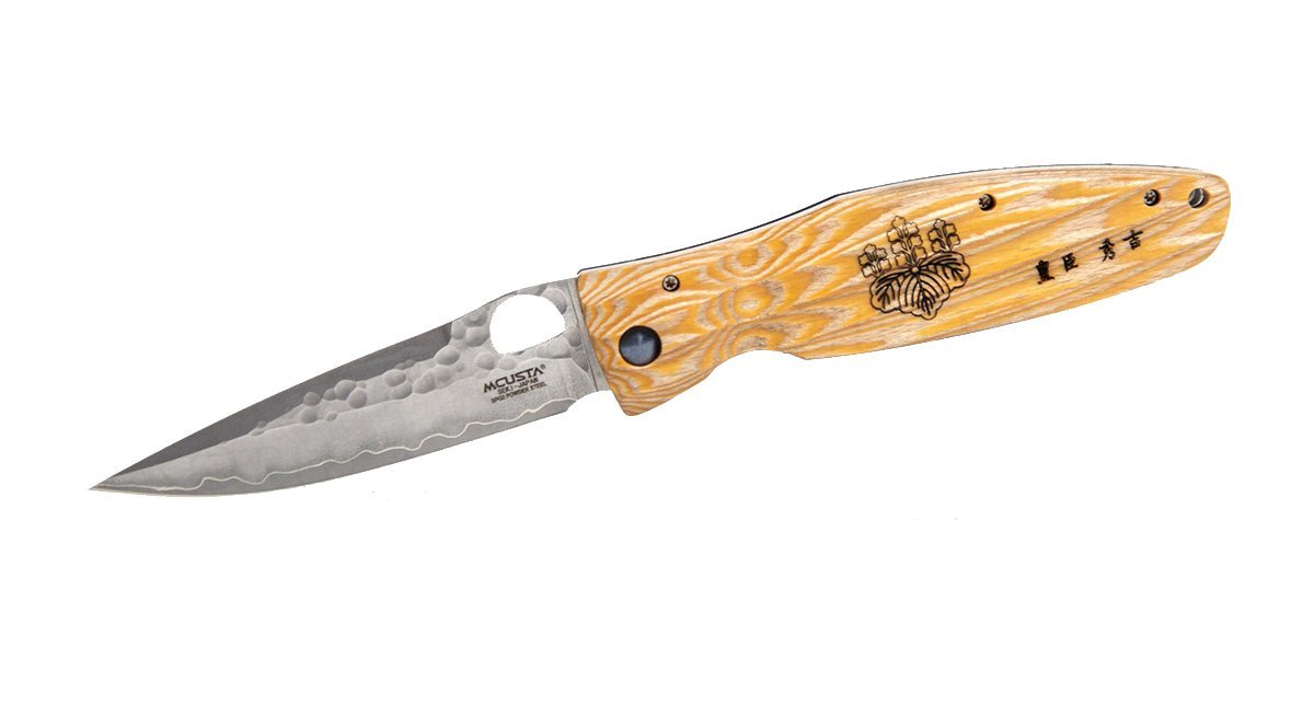 Pakkawood на модели произведен из остатков сохранившегося снаряжения самураев прошлой эпохи, накладки из нее имеют фрезерованные продольные канавки для более надежного удержания рукояти. Формирующая шарнир клинка резьбовая стяжка оснащена специальными скользящими шайбами, придающими плавность хода клинку при смене транспортного положения на рабочее.