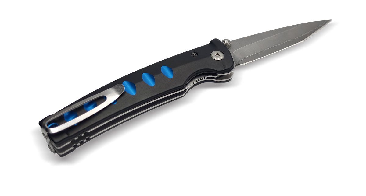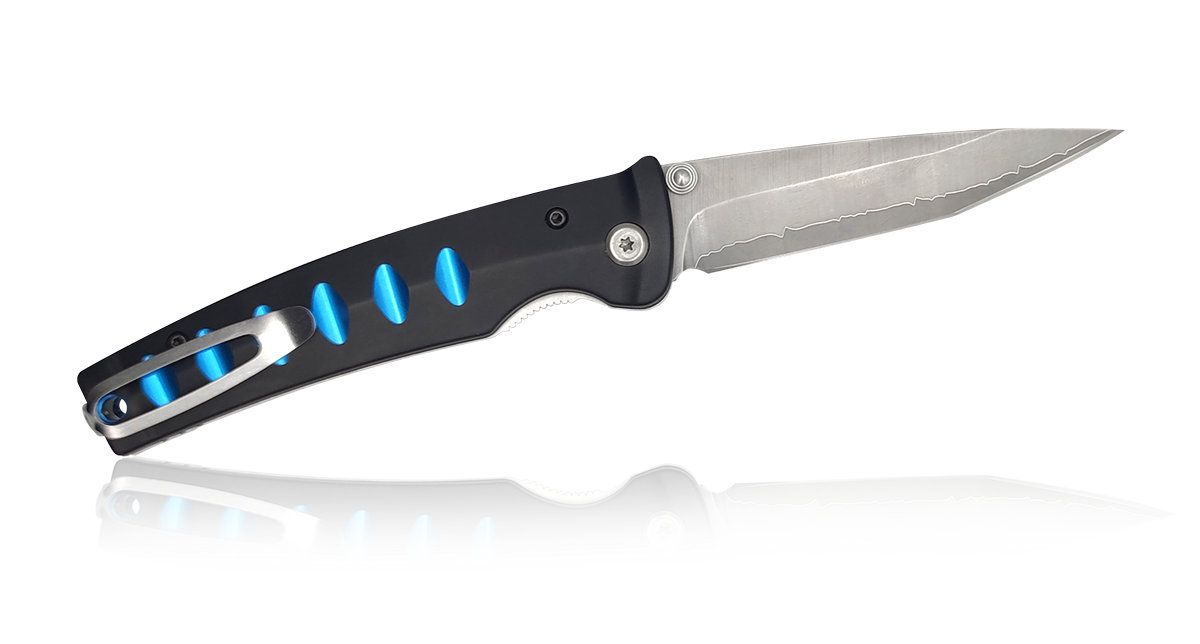 Рукоять состоит из трех частей – одной стальной плашки и двух цветных накладок из анодированного в два цвета (черный и голубой) авиационного алюминиевого сплава с фрезерованным узором, напоминающим обмотку рукоятей мечей шелковым шнуром Цукамаки. Практические назначение узора – надежное удержание рукояти ладонью.