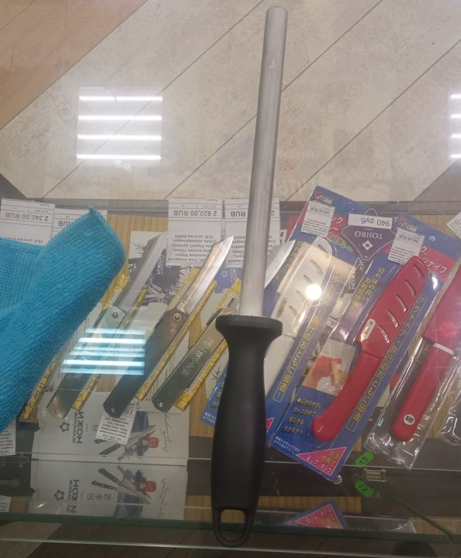 Изделие пользуется большим уважением и спросом среди профессиональных поваров. Заточка происходит по принципу «нож об нож», только вместо другого ножа используется мусат. Лезвие после такой заточки становится идеально острым. Для удобства эксплуатации инструмент оснащён удобной пластиковой ручкой. Хотите за секунды натачивать кухонные ножи — тогда вам обязательно стоит приобрести мусат Hatamoto.